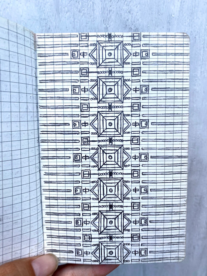 Starting around my sophomore year (2017-2018), I began challenging myself to fill entire pages with border designs. I enjoyed playing with how these designs could transition between each other and how different styles would mix. My philosophy: just keep adding detail! I've found that these are really nice to look back on and sometimes pick and chose designs I can go back to and use in projects. I've used a couple of these rows in scarf designs, scanning the pages in and manipulating it on photoshop to create seamless decorative borders.