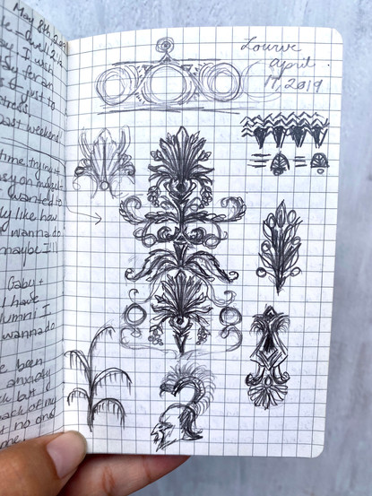 Above are examples of some sketches I did while traveling in Europe last year. I pulled inspiration from and took note of shapes on details in architecture, tiles, and pieces in museums. For example, in the first image from the left, at the bottom of the page, I sketched a tile from the Royal Alcazar in Seville, Spain, and, in the last image, I sketched different shapes and elements found on pieces at the Neues Museum in Berlin!